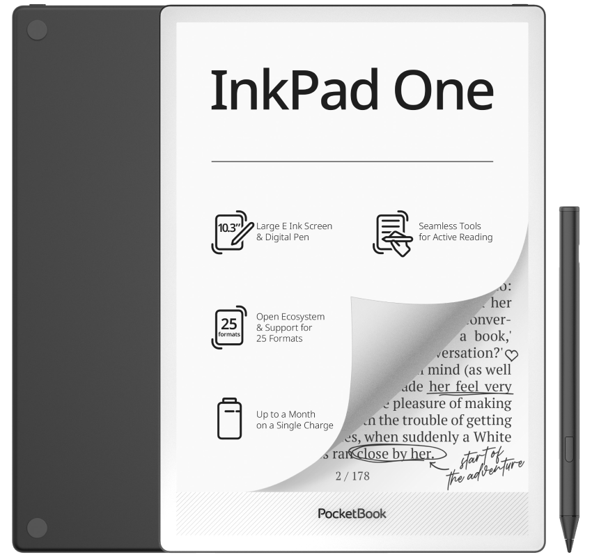 A PocketBook bemutatja az InkPad One-t, egy új, 10,3 hüvelykes, tollal ellátott e-könyv olvasót, amelyet aktív olvasáshoz és kényelmes kézíráshoz terveztek. A készülék papírszerű E Ink Mobius™ kijelzővel rendelkezik, és digitális tollal rendelkezik a természetes jegyzetelés érdekében, valamint számos beépített kézírás-eszközt kínál. Az InkPad One egy megfizethető, nagyméretű képernyős megoldás olvasáshoz, íráshoz és a mindennapi hatékonyság növeléséhez.